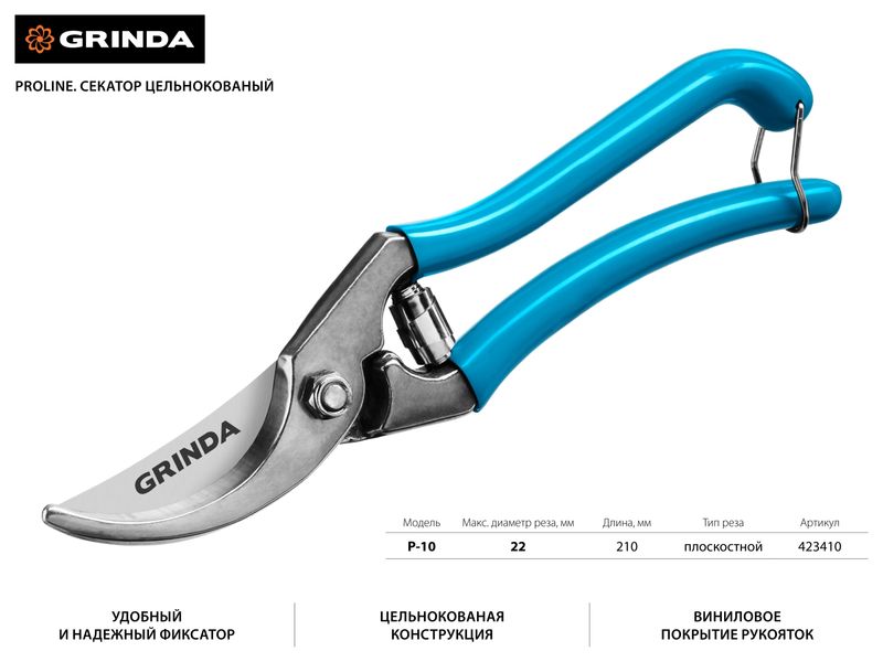 Секатор Grinda - цельнокованая, стальная конструкция.Виниловое покрытие на ручках обеспечивает отсутствие скольжения.